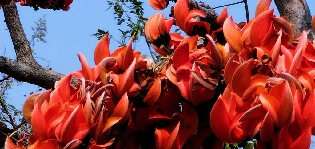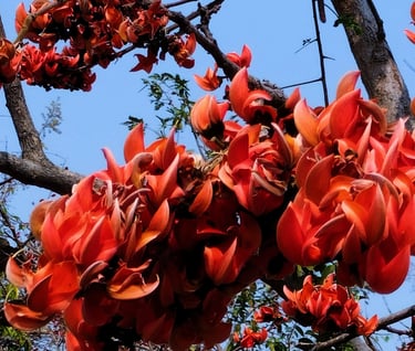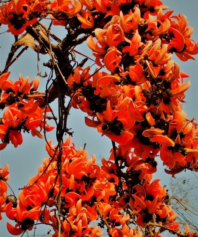 Butea monosperma, a deciduous, medium sized tree, known for its bright orange red colored flowers in bunches, which look like flames