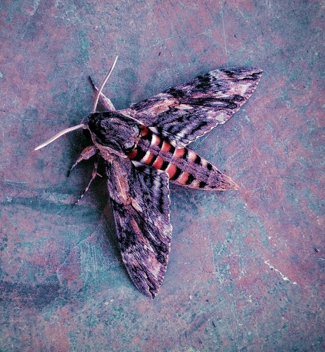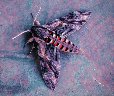 Agrius convolvuli are stout bodied moths with grayish wings and banded abdomen. Presence of narrow, but lengthy wings made them prolific fliers and usually find hovering over the flowers, sucking the nectar. Abdomen has long gray stripe running down and alternative bands of pink and black. Presence of long proboscis acts as a feeding tubes which helps feeding on nectar of tubular flowers of Ipomoea sps. and similar kind of flowers of Nicotina sylvestis.